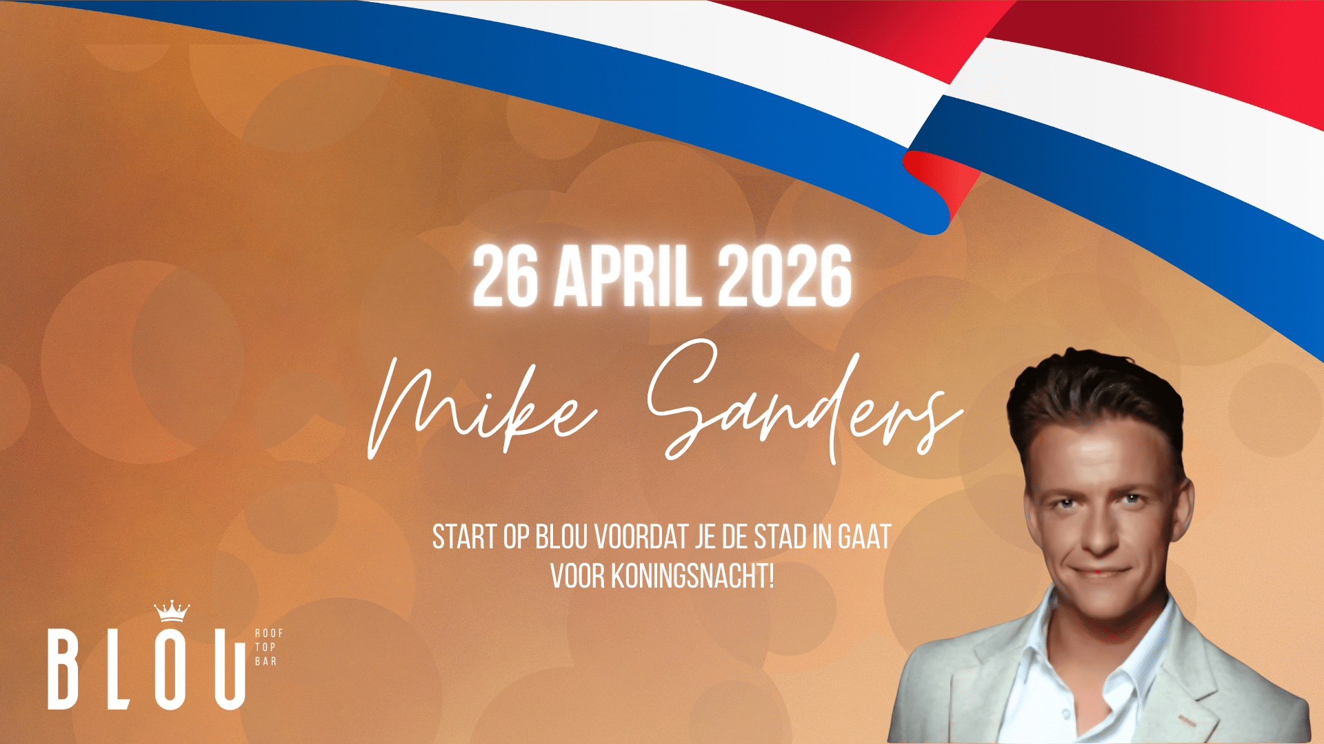 Op 26 april is BLOU Rooftop Bar geopend van 14:00 tot 18:00 uur, het perfecte begin van jouw Koningsnacht. We verwelkomen zanger Mike Sanders voor een live optreden van 15:00 tot 15:45 uur. De ideale vibe om alvast in de stemming te komen voordat je de stad induikt.